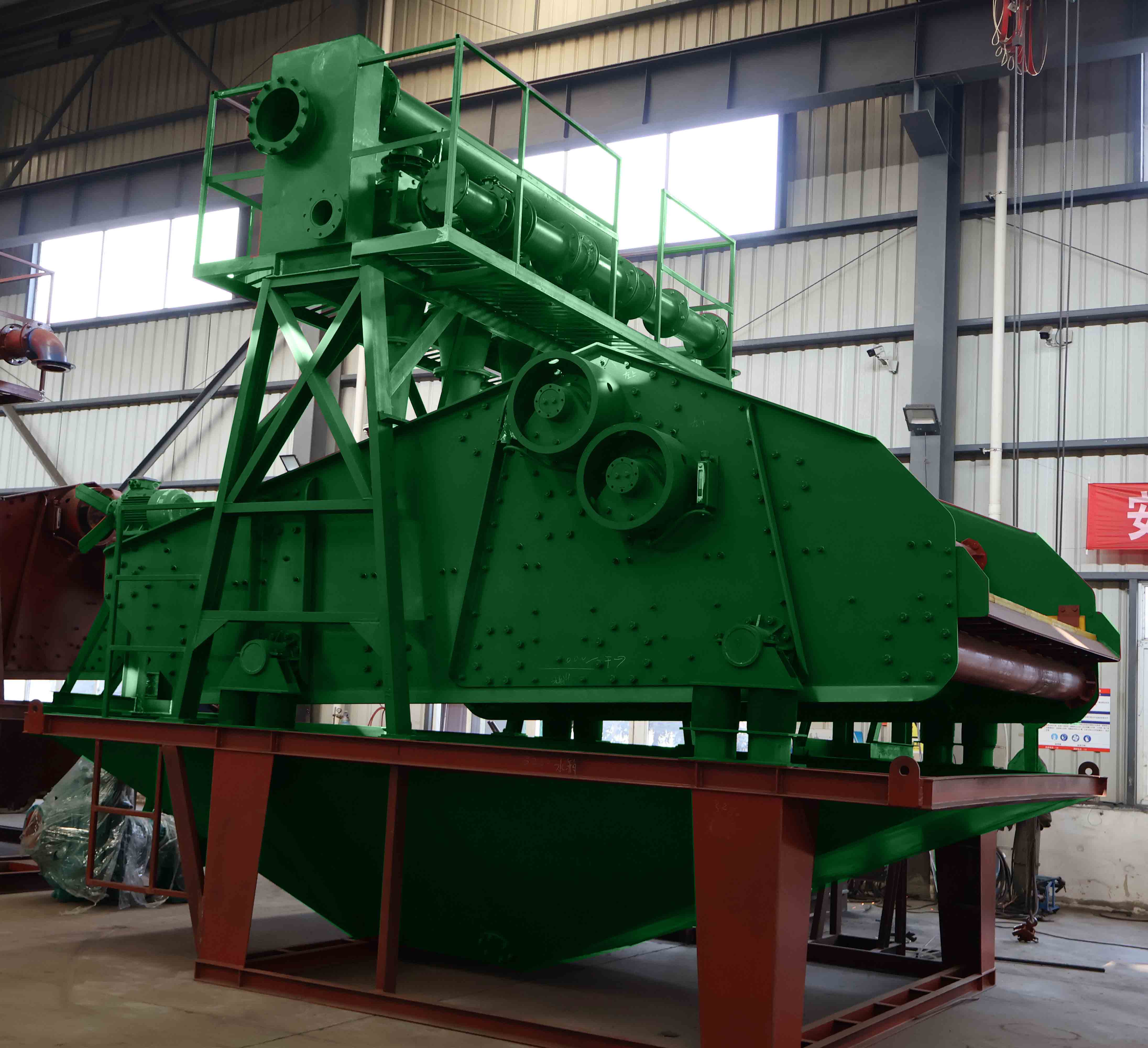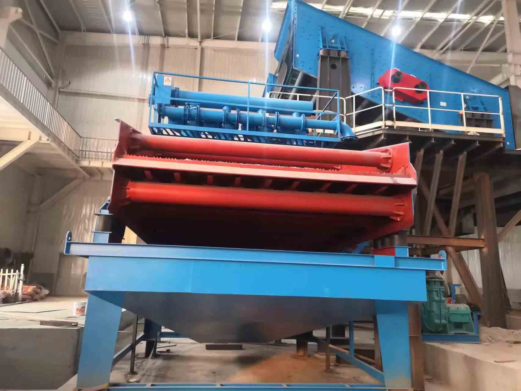 砂和水的混合物进入重型脱水筛或轻型脱水筛,大部分中、粗砂通过脱水筛,脱水并输送到脱水筛中间部分位置。同时由于浮力作用大部分水和细砂通过滤隔板进入储水箱通过渣浆泵把储料箱内水和细砂输送到水力旋流器内,然后离心分级浓缩后的细砂,经水利旋流器出砂口也进入重型脱水筛的中间部分位置粗、中、细三种砂在脱水筛进行二次脱水,混合后,在脱水筛出料口送入皮带运输机。储料箱内的废水、泥、粉层、杂质等,经过旋流器溢流口排出。