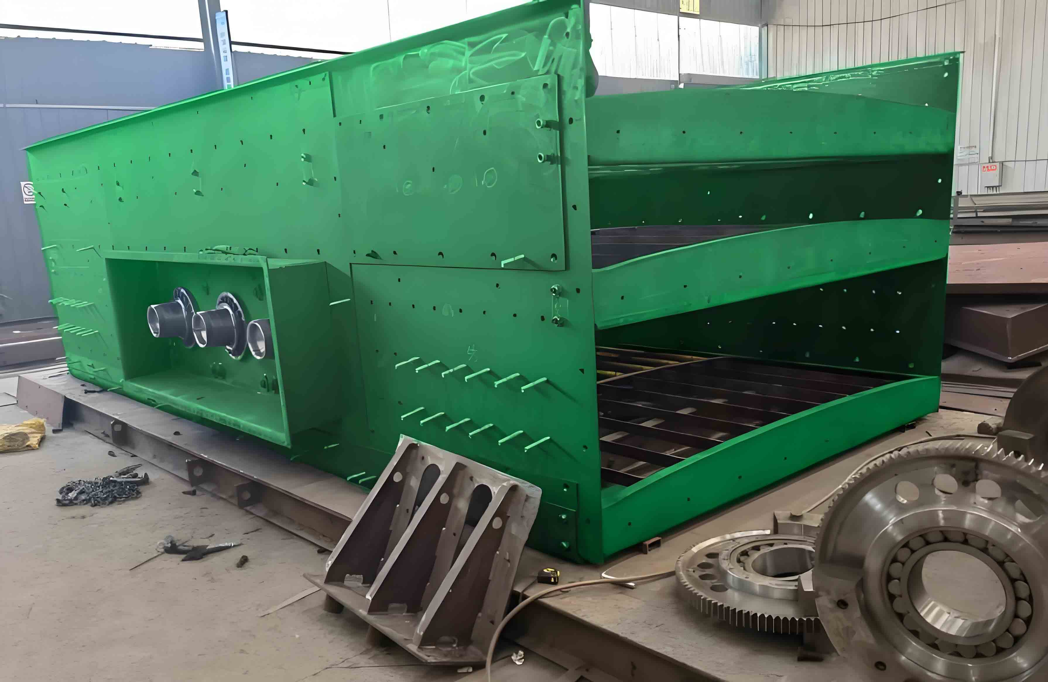 该振动筛由电机、传动装置、筛箱、橡胶复合弹簧、底架、阻尼器等构成。该设备工作时,动力从电机经三角皮带传递至激振器主动轴、齿轮振动器(速比为1),实现三根轴同速旋转,产生激振力,激振器与筛箱高强度螺栓联接,产生椭圆运动。物料在筛面上随筛机高速椭圆运动,迅速分层、透、向前,终完成物料的分级。